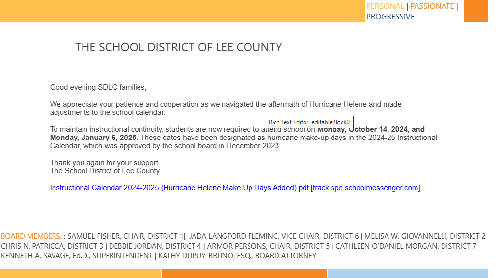 "To maintain instructional continuity, students are now required to attend school on Monday, October 14, 2024, and Monday, January 6, 2025. These dates have been designated as hurricane make-up days in the 2024-25 Instructional Calendar, which was approved by the school board in December 2023."