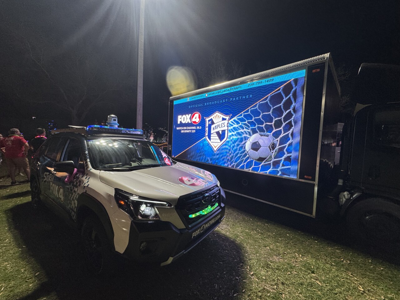 Cape Coral Community Correspondent Bella Line hands out keepsake hockey pucks to the crowd, as FOX 4 is the official Southwest Florida broadcast partner of the Stanley Cup Champion Florida Panthers — and fans can get the games free over the air on channel 36.3 or on Xfinity channel 221.