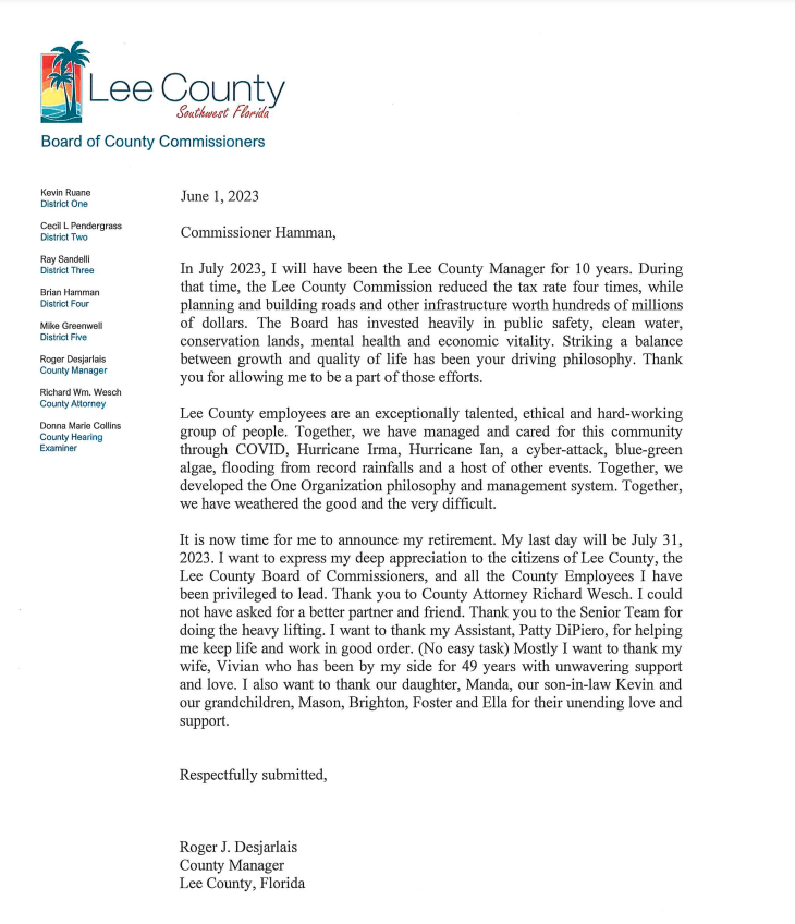 LEE COUNTY, Fla. — The Lee County Manager Roger Desjarlais plans to retire at the end of July.