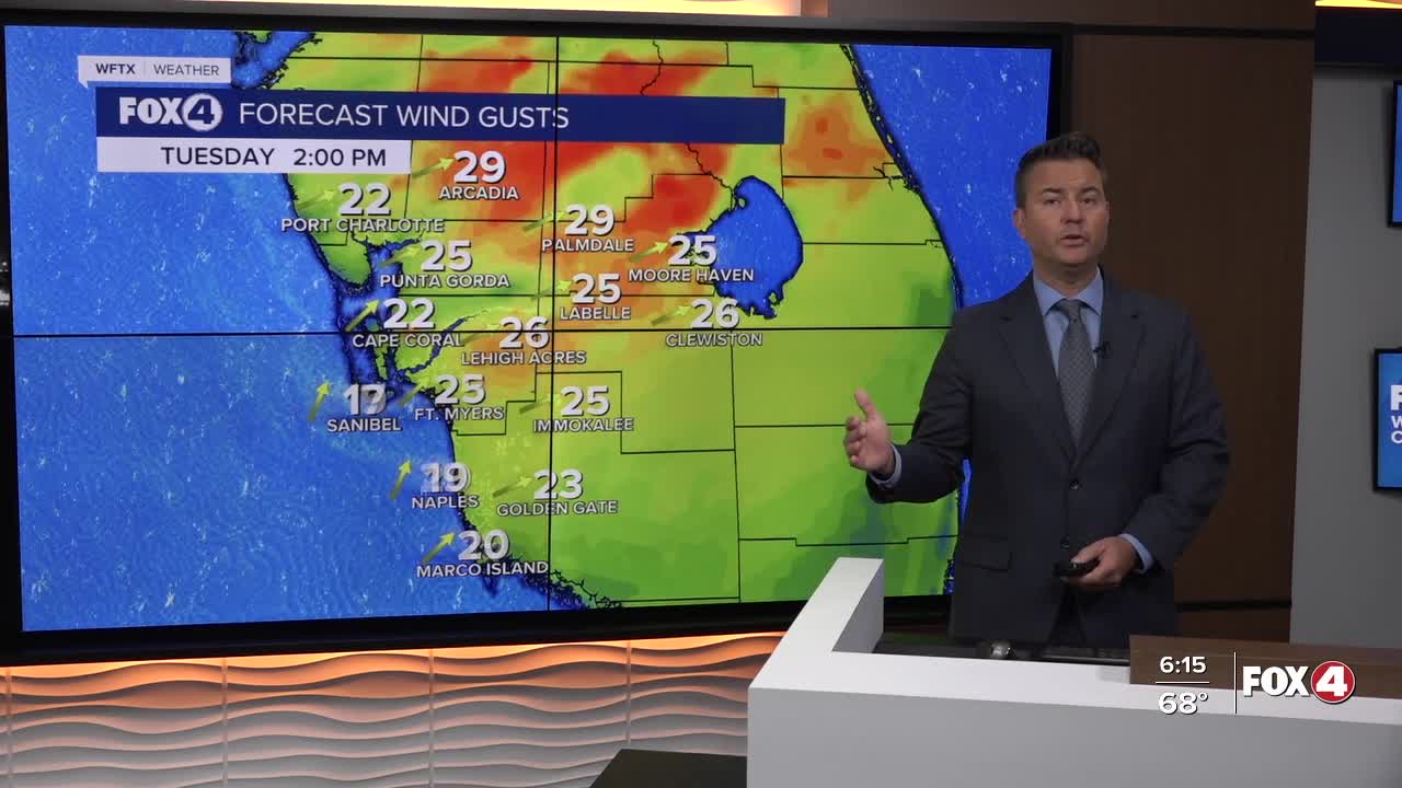 We are waking up cloudy this morning and waiting for the wind to pick up ahead of the front. The wind will be out of the south and gusting 25-30mph out of the southwest by lunchtime. We will see a 30% chance of an isolated shower mainly between 10am and 4pm this afternoon. We need the rain. November ended up tying for the driest on record in Fort Myers with a Trace of rain the entire month. That means we are now officially behind 17.97" for the year.