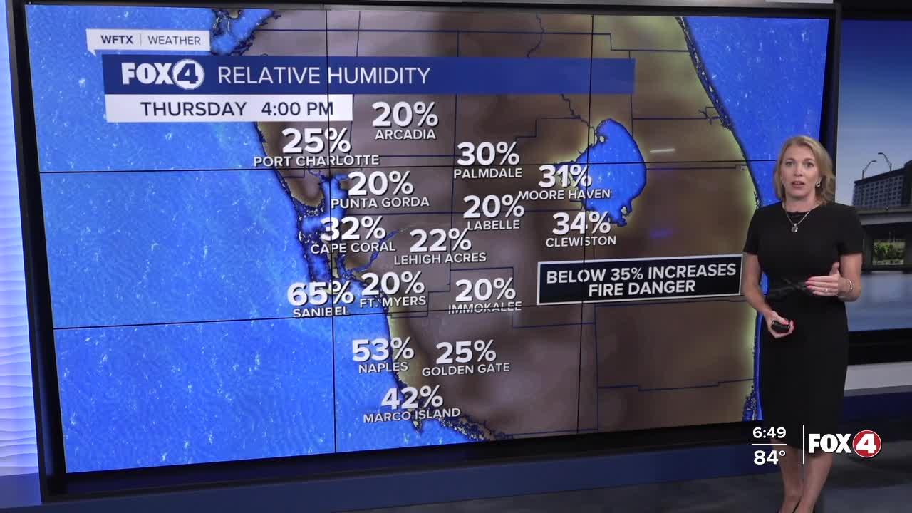 The National Weather Service says despite the low relative humidity, lighter winds on Thursday should keep SWFL out of a Red Flag Warning. Nonetheless, any fire that does start could spread quickly as the ground is very dry, and there's no chance for significant rainfall in the next 7-days.