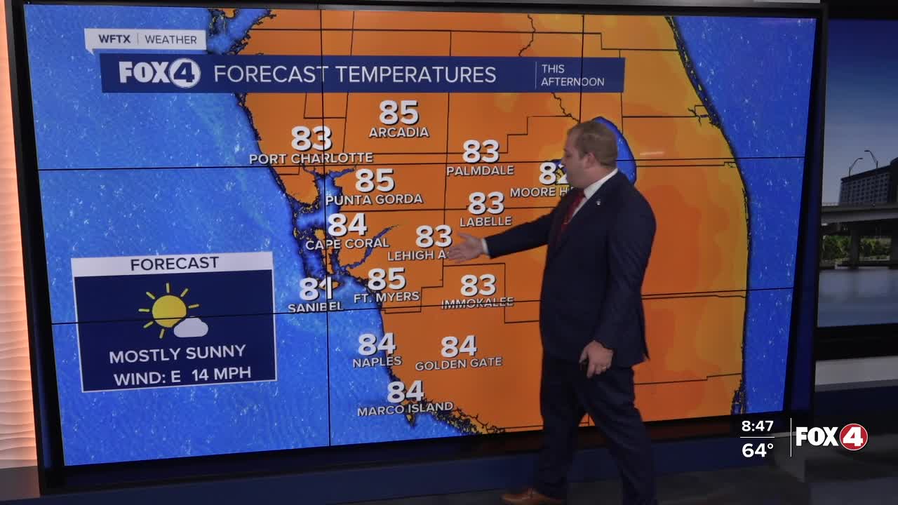 Good morning, Southwest Florida! After a cooler last two days, temperatures are warming back up. This morning we saw morning temperatures running 10-15 degrees warmer than Saturday. This afternoon highs will warm into the mid-80s with mostly sunny skies. Still with an east breezy, a few showers could pass through our inland communities. Tonight, temperatures will cool in the mid-60s with partly cloudy skies.