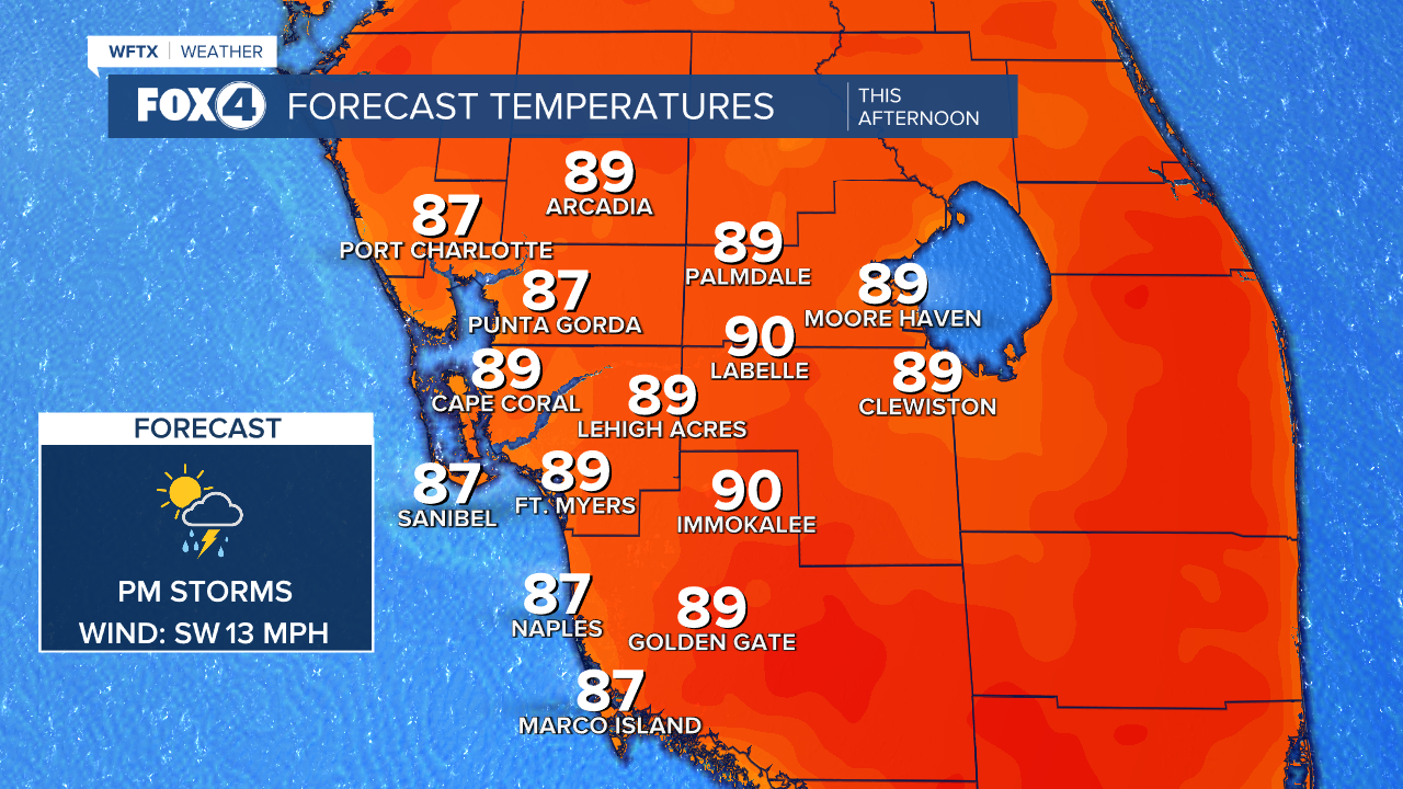 Sunday will start with mostly sunny skies as temperatures climb into the lower 90s. Afternoon storm will start up around 2pm.