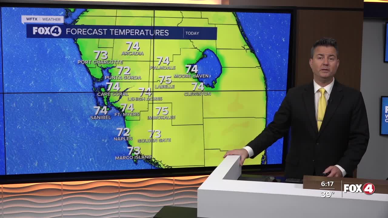 Good morning, Southwest Florida! We are waking up to a warmer morning with temperatures up 10-15 degrees depending upon your location. There is a spread in our temperatures with mid 50s in Collier county and upper 30s in Charlotte and Desoto counties. This afternoon we will see our highs climb into the mid 70s with mostly sunny skies. The wind will start light out of the east before turning picking up and turning out of the southwest ahead of cold front that will arrive tomorrow.