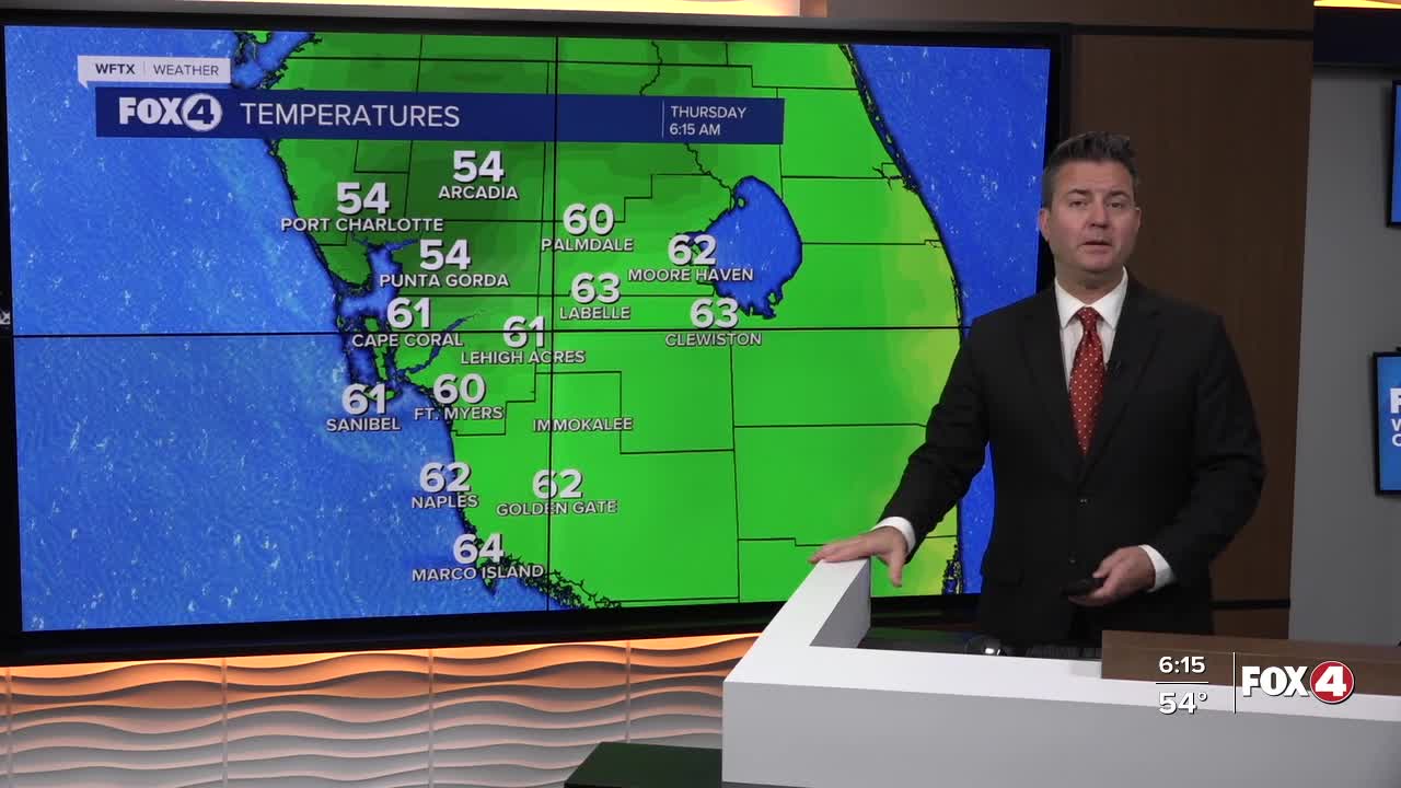 Good morning, Southwest Florida! We are waking up a little cloudy and warmer this morning with temperatures in the mid 50s north of the Peace River and low to mid 60s south through Collier county. Today we will be mostly cloudy at times with the wind out of the east-northeast gusting in the low to mid teens. Despite the cloud cover, we are expected to be even warmer today with highs in the low 80s, which is above our average of 75° for this time of the year.