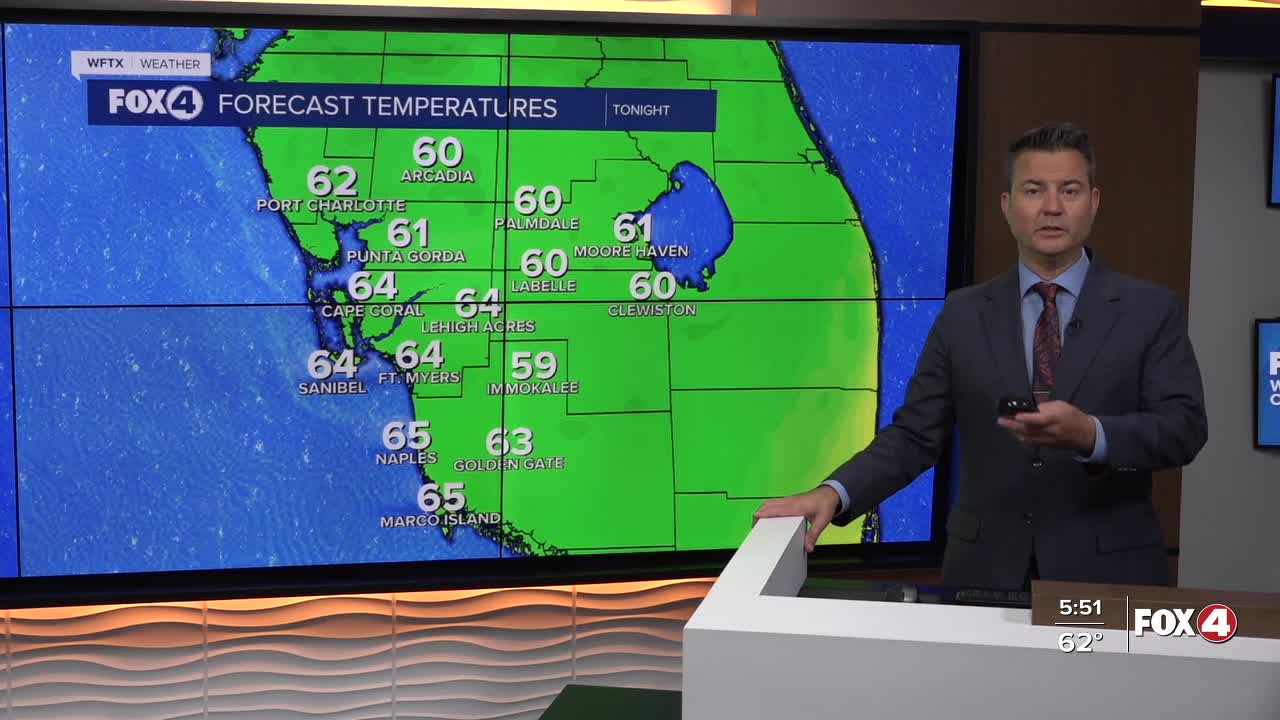 Good morning, Southwest Florida! We are waking up 10-12 degrees cooler this morning with temperatures sitting in the mid to upper 50s, which is much closer to our average of 59° for this time of the year. This afternoon we will see a mix of sun and clouds with highs climbing into the low 80s. Our average high for this time of the year is 79°. The wind will be light 5-10mph staring east and turning out of the southwest in the afternoon.