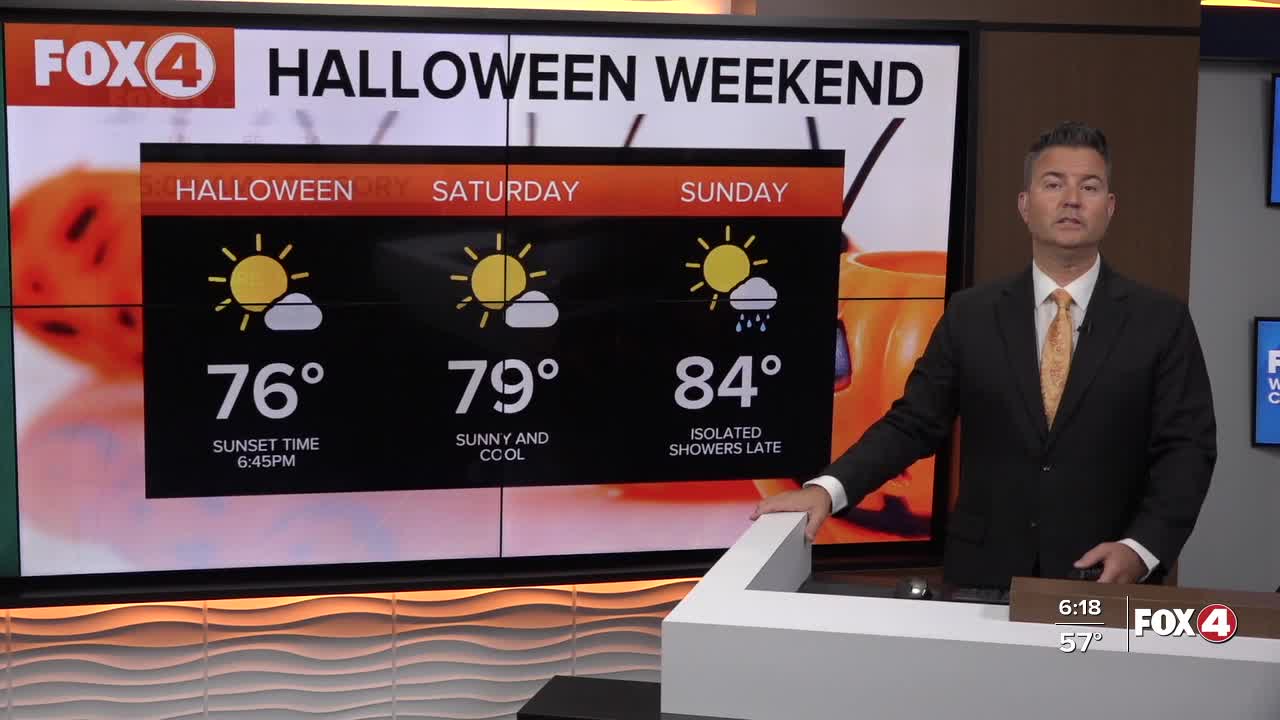 Happy Halloween and good morning, Southwest Florida! We are waking up to an absolutely fantastic start with temperatures in the upper 50s to mid 60s around town this morning. We are expecting a gorgeous Halloween with mostly sunny skies and highs in the mid 70s. We are forecasting a high of 76° this afternoon and that is well below our average of 84°. This will mark the coolest Halloween in over a decade. As you make your plans for Trick-or-Treating this evening, sunset is at 6:45PM and temperatures at 7PM should be around 70°