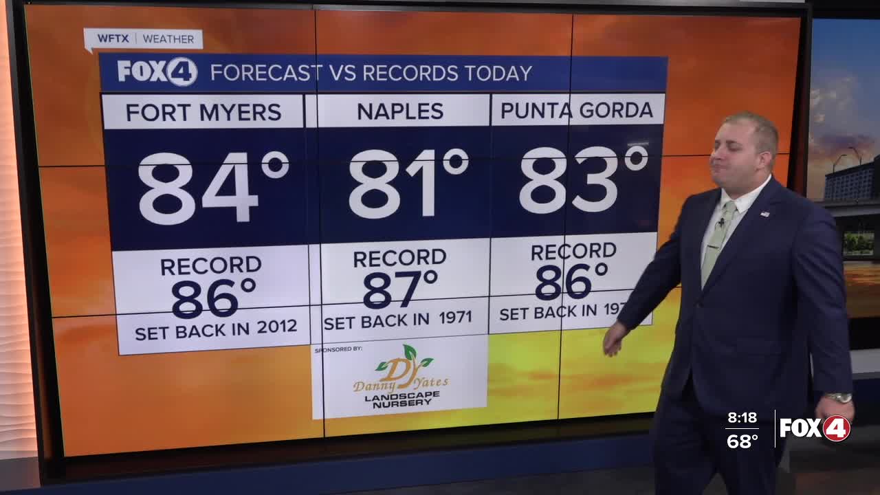 This morning, we woke up with areas of dense fog with lows in the mid to upper 60s. That fog has since cleared, with mostly sunny skies and highs in the low to mid 80s expected this afternoon. While we did break the record high temperatures in Fort Myers on Saturday, Sunday should stay a degree or two below records as winds will be increasing. Expect those gusts up to 25 mph out of the south.