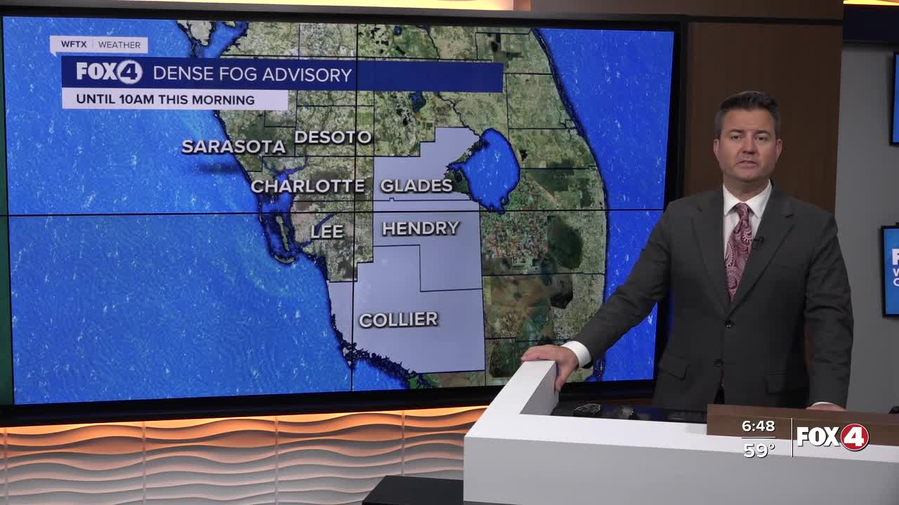 Good morning, Southwest Florida! We are waking up with fog around the area. We have a Dense Fog Advisory for Glades, Hendry and Collier counties until 10am as visibility will be less than a 1/4 of a mile at times. The fog will mix out and this afternoon lots of sunshine with highs in the mid 80s. We are forecasting 84° which is nearly 10° above our average of 75° for this time of the year. The wind will be fairly light today 5-10mph out of the east-northeast.
