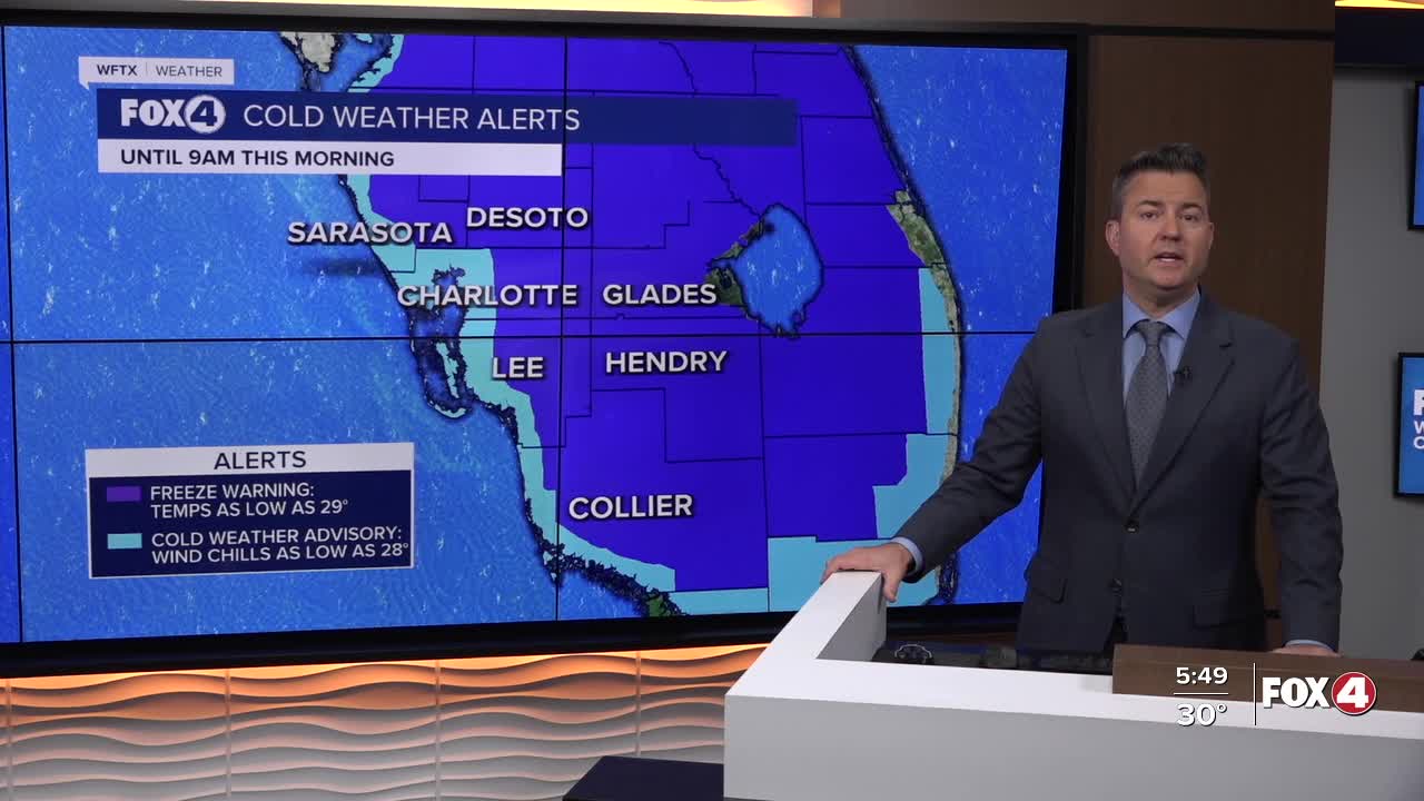 Good morning, Southwest Florida! We are waking up to yet another cold morning with some areas below freezing once again. A Freeze Warning is in effect until 9AM from all of DeSoto, Glades and Hendry counties along with inland Lee, inland Collier and inland Charlotte counties. The coastal areas of Lee, Collier and Charlotte counties have a Cold Weather Advisory in place until 9AM with the possibility of wind chill values in the upper 20s.