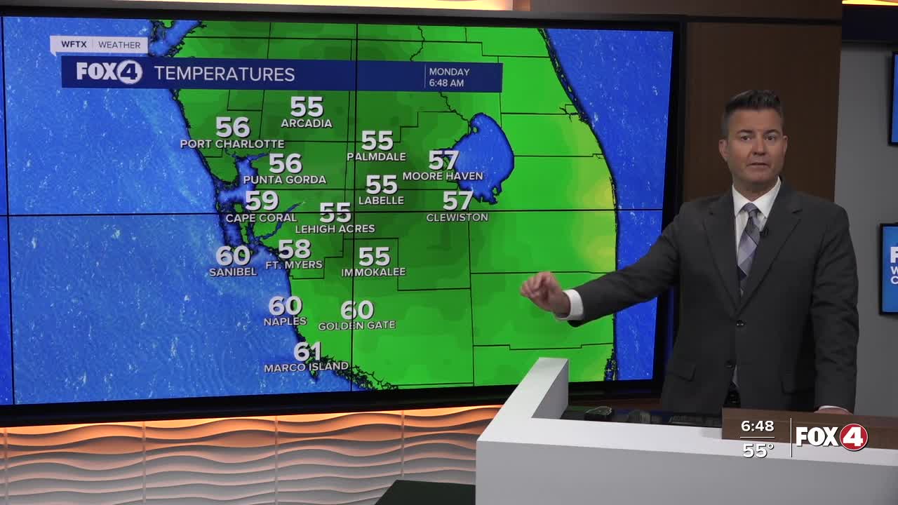 Good morning, Southwest Florida! We are waking up much cooler this morning with temperatures in the low to upper 50s. While it is roughly 10 degrees cooler this morning, the cold front that moved through has just brought us back down near average this morning which is 58°. This afternoon it will stay breezy and cool with highs in the low to mid 70s. The wind will gust out of the northeast 20-25 mph making it feel much cooler outside. We see mostly sunny skies early then turning partly cloudy later this afternoon.