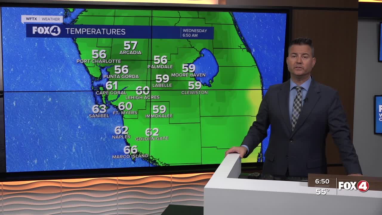 Good morning, Southwest Florida! We are waking up to partly cloudy skies and temperatures in the mid 50s north of the Caloosahatchee River and mid 60s south. We will see more sunshine today as our skies clear and that will push our temperatures in the mid to upper 70s. We are forecasting 76° today and that is just two below our average. Winds will be out of the north early, but will shift northwest later in the day and will start to gust near 15mph.