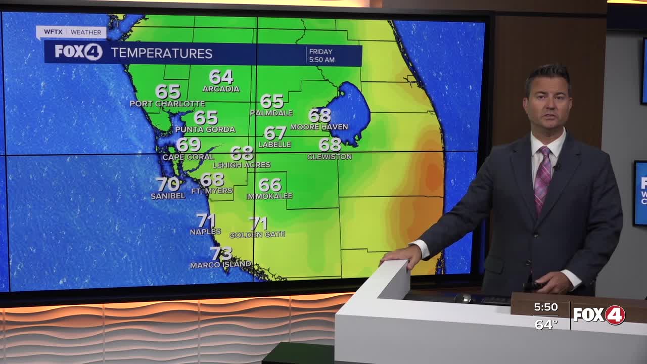 Good morning, Southwest Florida! We are waking up a little cooler this morning with a nice drop in the humidity as well. Temperatures are sitting in the mid to upper 60s in many locations, roughly 5 degrees cooler than yesterday. Our average low this time of the year is 67°. Despite the weak cold front moving through yesterday there will not be a lot of change with our afternoon highs. We will reach the upper 80s once again today with mostly sunny skies.