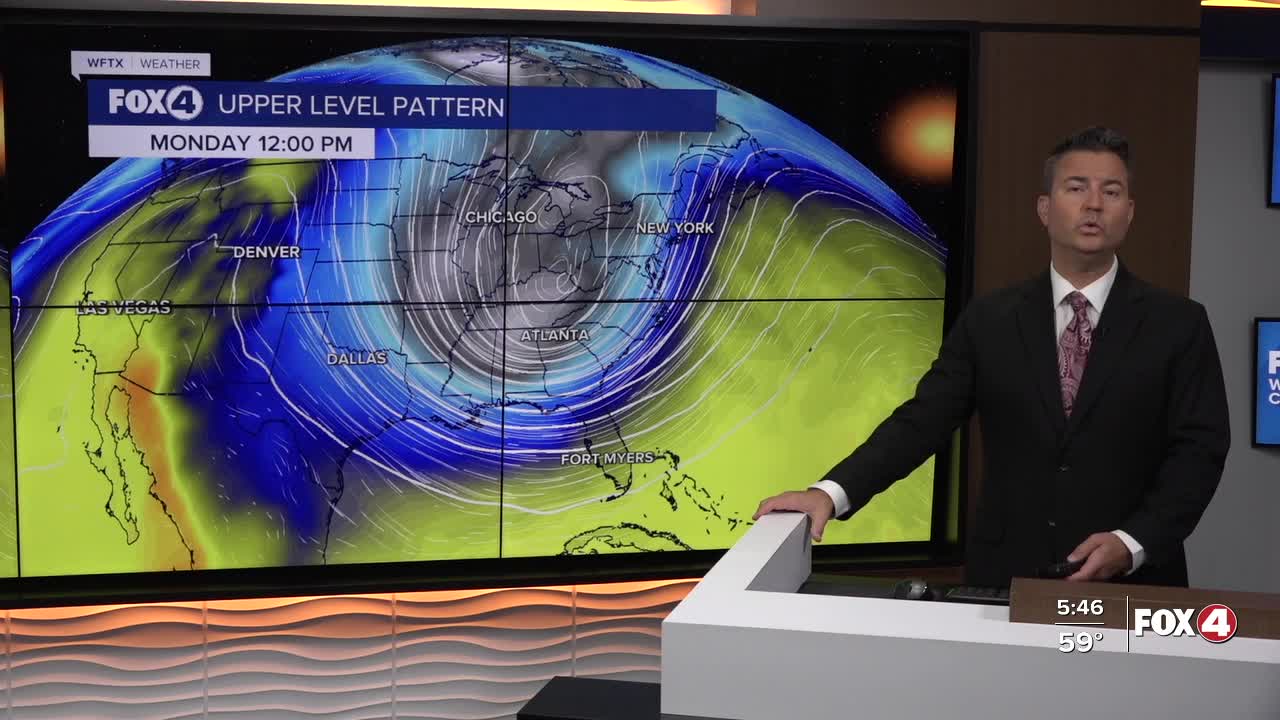 Good morning, Southwest Florida! We are waking up a little bit warmer with temperatures in the low to mid 60s across much of the area. There are some spots in Charlotte and DeSoto counties where we are starting in the upper 50s. Today we will start off sunny, but clouds will move in throughout the day and at times we will be mostly cloudy. Despite the cloud cover there is no chance of rain today. Our highs will reach 84° which is just a touch above our average of 83°. The wind will be out of the east gusting in the low to mid teens.