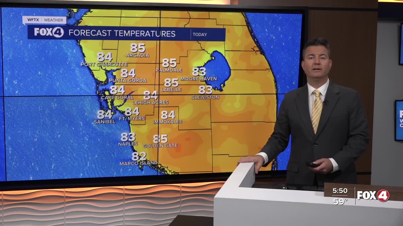 Good morning, Southwest Florida! We are waking up warm this morning with temperatures in the mid 60s across much of the area. This afternoon we will see a good mix of sun and clouds and our highs will climb into the mid 80s, which is well above our average of 77° for this time of the year. The wind will start out of the east-southeast and turn more out of the south bringing in more humidity and warmth.