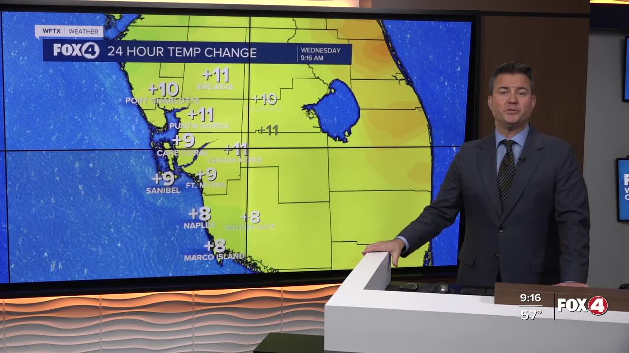 Overnight, clouds start to increase and we get even warmer with expected to drop to around 60 in Fort Myers which is above our average of 54° for this time of the year. Tomorrow will be cloudy but no chance of rain with temperatures climbing into the low 80s.