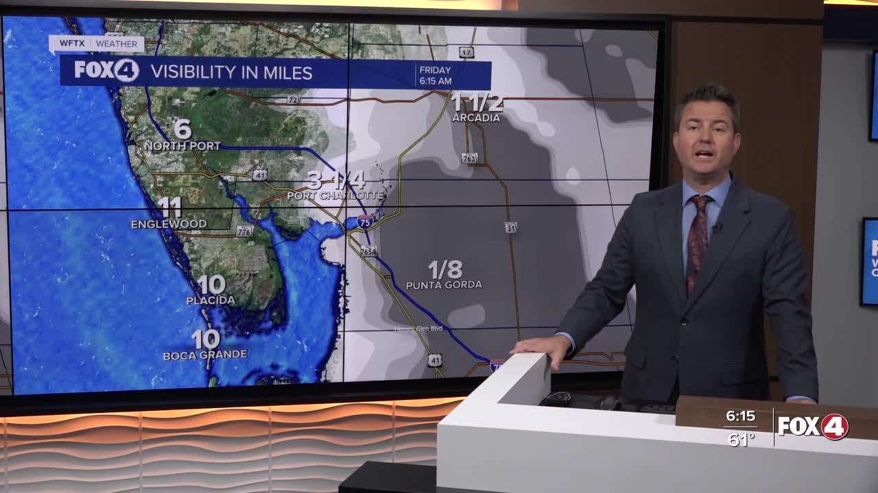 Good morning, Southwest Florida! We are waking up with fog around the area this morning with visibility limited to less than 1/2 a mile in many locations. Our temperatures are in the low to mid 60s, which is above our average low of 57°. The fog will mix out after sunrise which is at 6:59am this morning. Today the winds will once again be out of the southwest and that will quickly warm us up and give us a few passing clouds. Temperatures will be in the mid 80s. We are forecasting 86° this afternoon and that forecast will hold for Saturday as well.