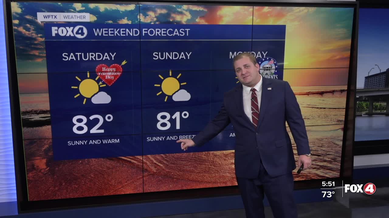 Sunday will be windy with gusts to 25 mph. The windy weather is ahead of an approaching cold front, which will bring scattered showers and storms to Southwest Florida Sunday night into Monday morning, President's Day. While President's Day will start off wet, we'll finish dry and in the mid to upper 70s. Unlike the past couple of fronts, this one will not bring a dramatic temperature drop. The forecast high for Monday is 78° and by Tuesday we are right back up to 80° and will stay close or just above 80° through Thursday.