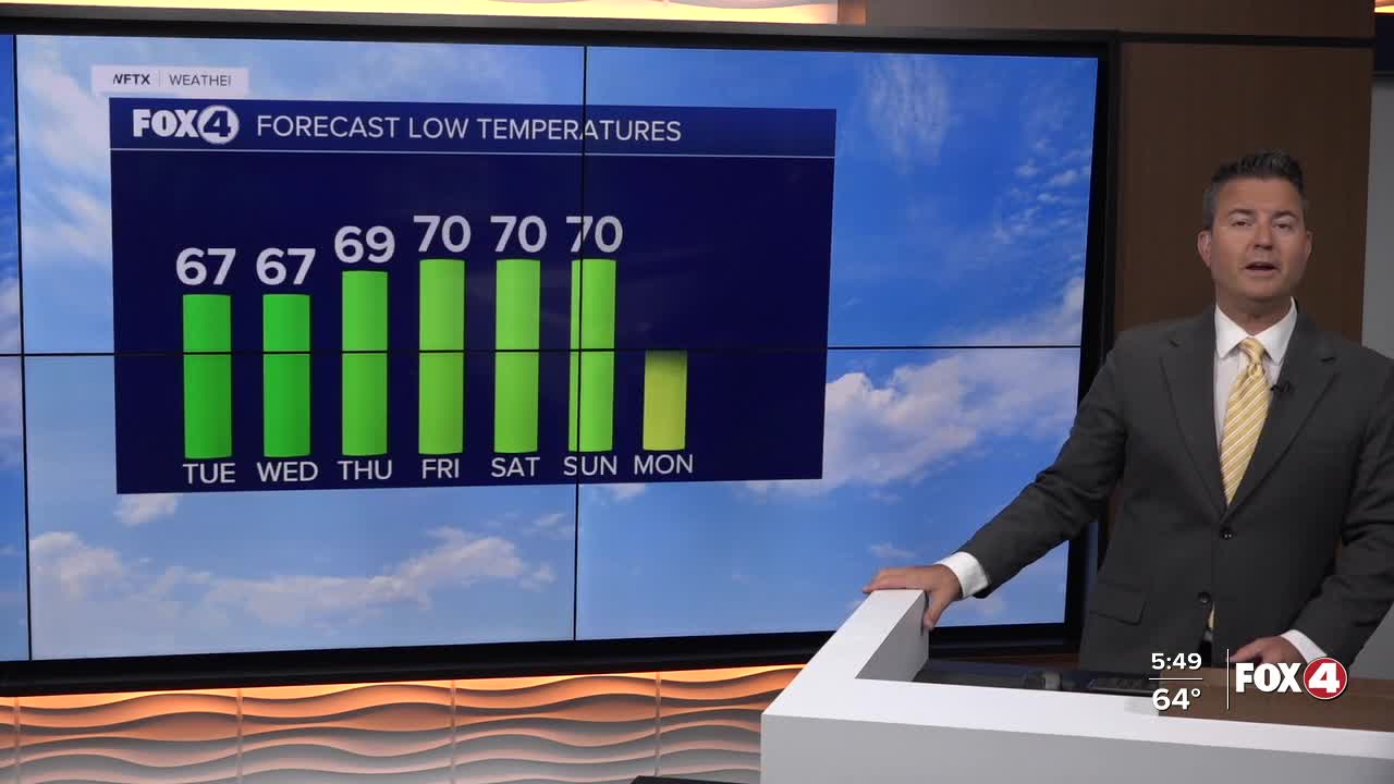 Good morning, Southwest Florida! We are waking up with temperatures in the mid to upper 60s this morning with a few low 70s in southern Collier County. Our normal low for this time of the year is 71° so we are slightly below that number thanks to the low humidity and cooler air that moved in over the weekend.