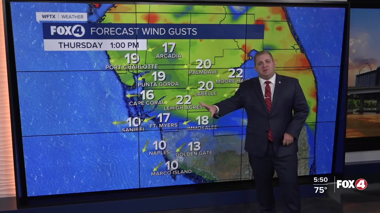 Wind gusts will increase more-so Friday, up to 30 mph. Because of these windy conditions, a Small Craft Advisory will go into effect at 8 p.m. on Thursday and continue through Sunday morning. For Collier county, this will expire early on Saturday morning.